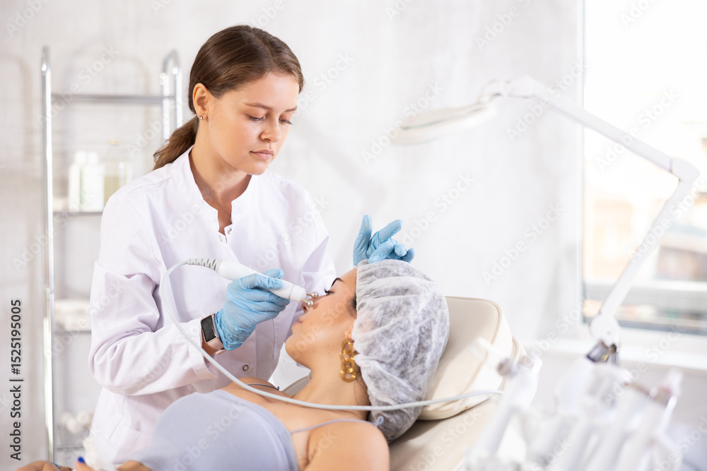 Fotografie Young brunette girl having facial beauty massage with beauty machine attachment