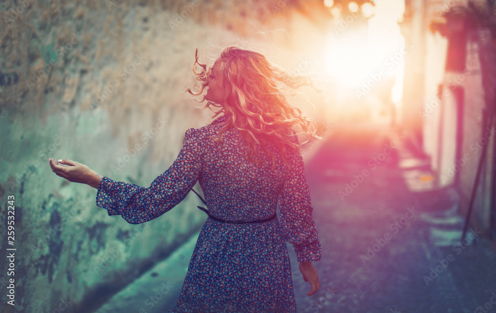 Fotografie Young carefree woman walking on mediterranean street in sunset