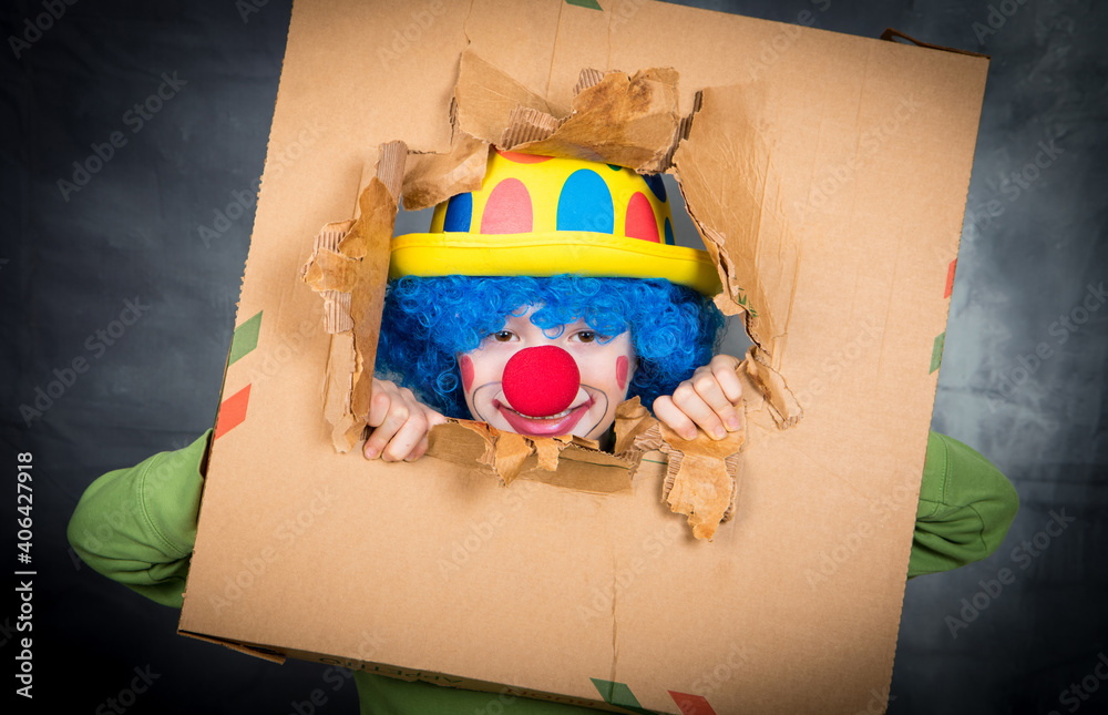 Fotografie young child dressed as a clown with wig and fake nose has fun watching from the