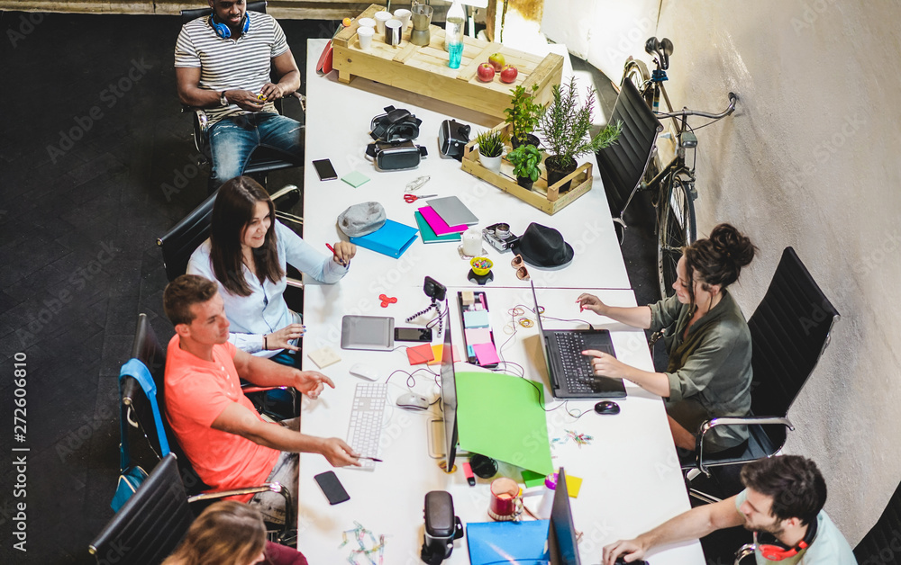 Obraz na plátně Young co-workers team talking during startup - Happy people planning a new proje