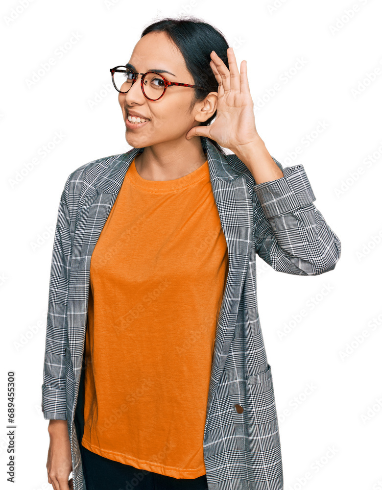 Fotografie Young hispanic girl wearing business jacket and glasses smiling with hand over ear listening an hearing to rumor or gossip