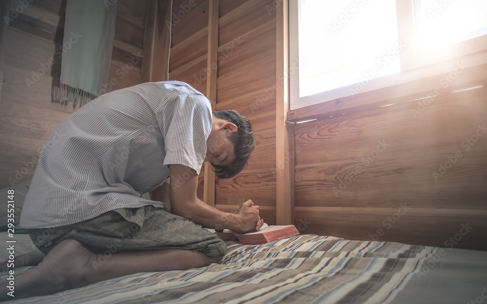 Fotografie Young male sitting praying on holy Bible with morning light in bed room