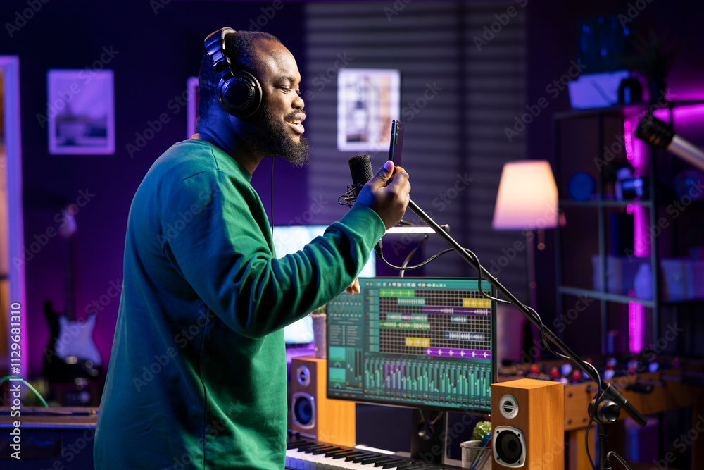 Obraz na plátně Young musician songwriter recording an acoustic version of his song, performing live on microphone in home studio