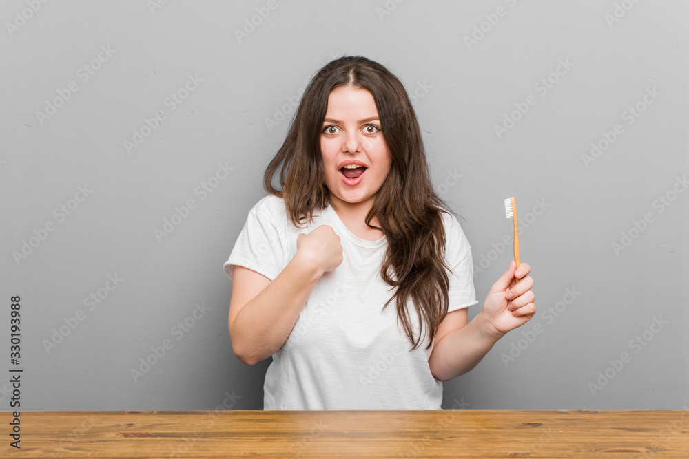 Fotografie Young plus size curvy woman holding a toothbrush surprised pointing at himself, smiling broadly