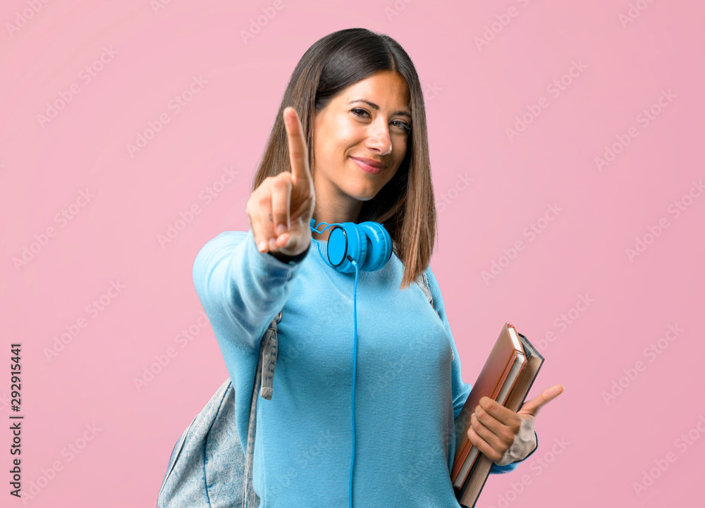 Fotografie Young student girl with blue sweater and headphones showing and lifting a finger