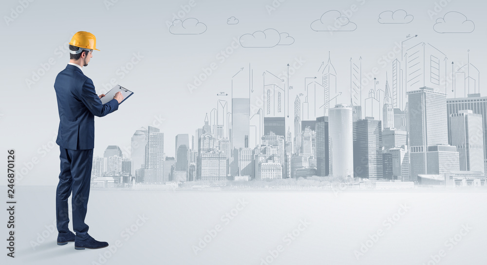 Fotografie Young supervisor architect standing and replanning a big city panorama
