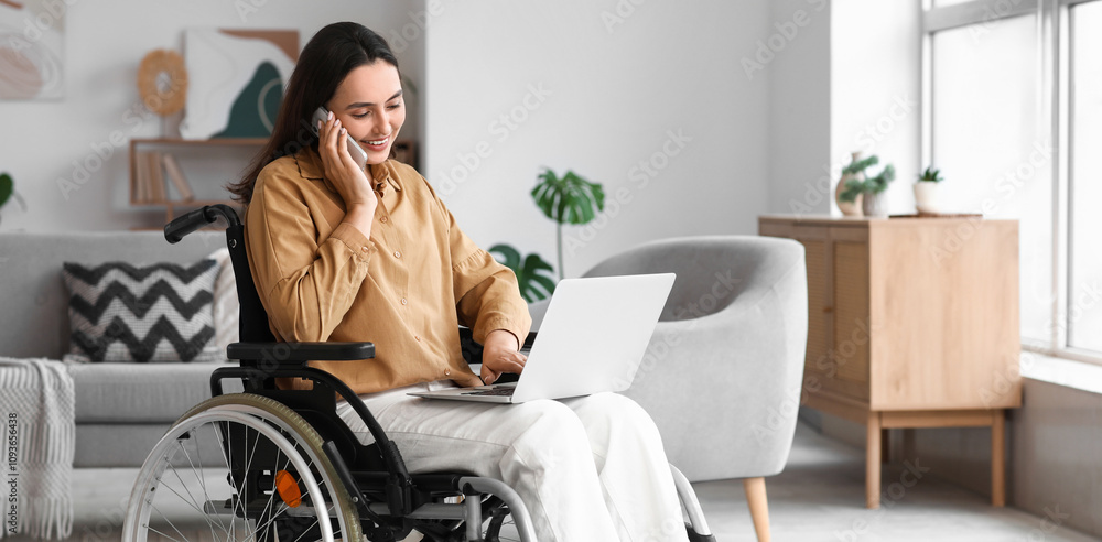 Fotografie Young woman in wheelchair and with laptop talking by mobile phone at home