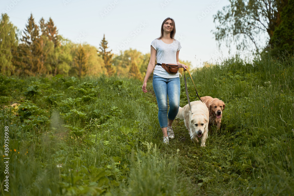 Fotografie Young woman on walk with two dogs in park on summer