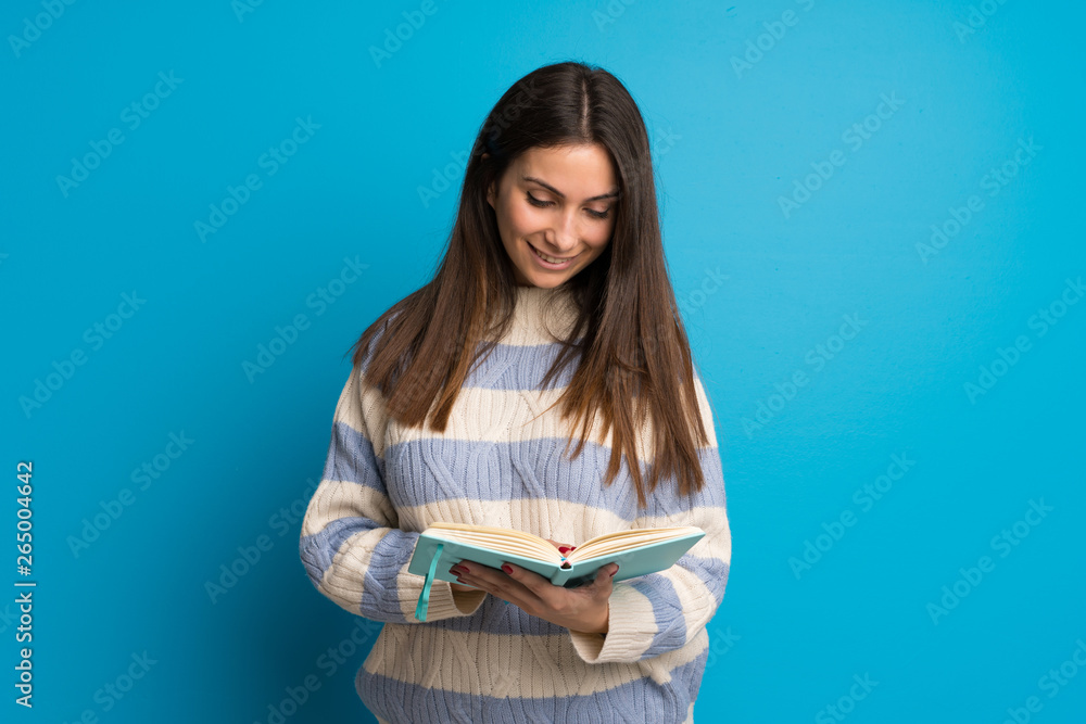 Fotografie Young woman over blue wall holding a book and enjoying reading