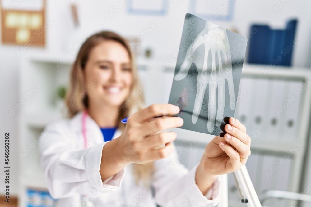 Fotografie Young woman wearing doctor uniform holding xray at clinic