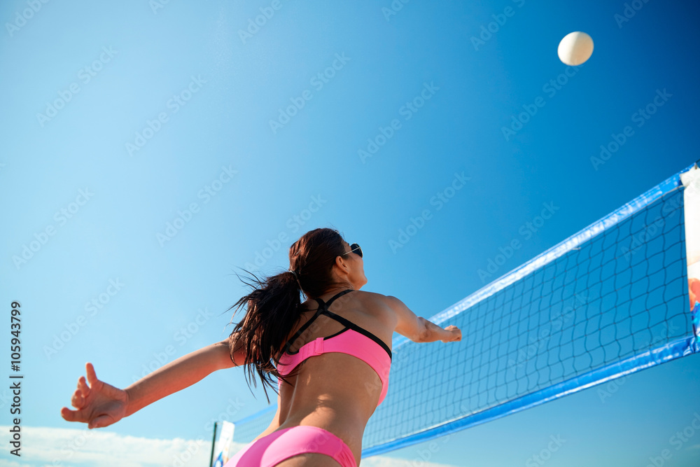 Obraz na plátně mladá žena s míčem hrát volejbal na pláži