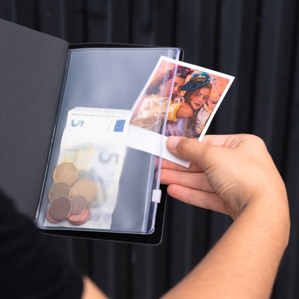 Cestovní zápisník Stranger Things s měkkým obalem z umělé kůže: dvě vyměnitelné náplně (linkovaná a tečkovaná) a pružná páska pro uzavření; vzadu dvě praktické plastové přihrádky — slot na karty a kapsa na drobnosti. Ideální na cesty i každodenní plánování.