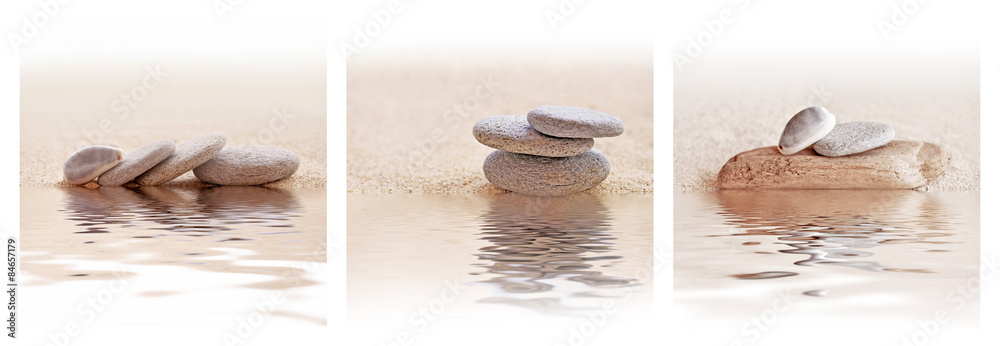 Obraz na plátně Zen sand and stone triptych with water reflections